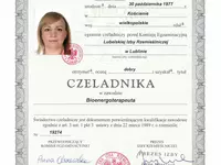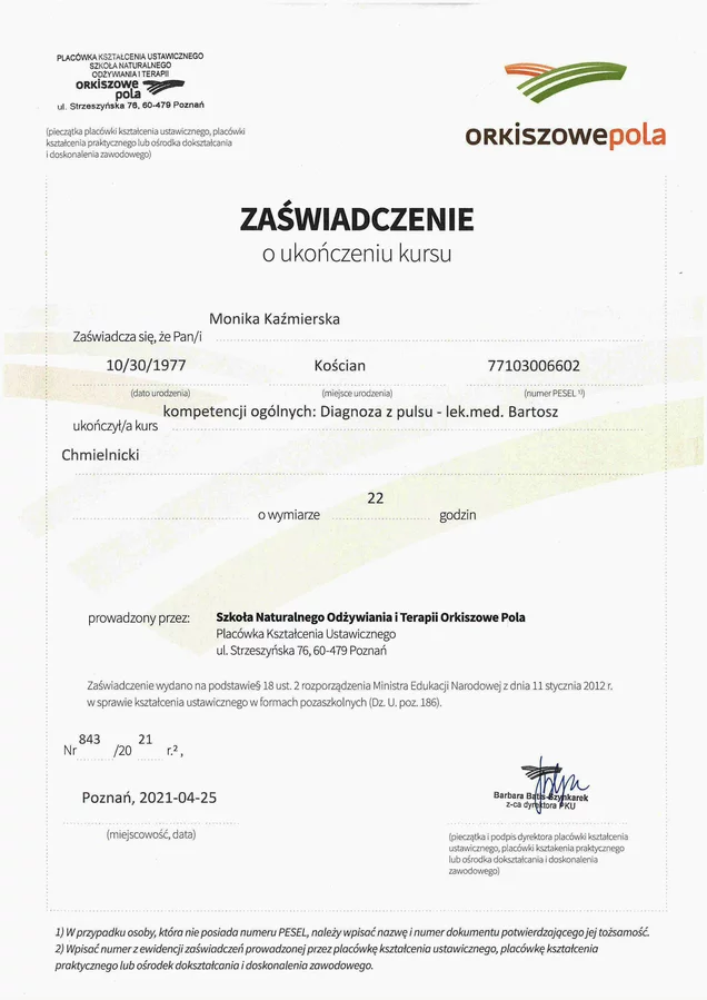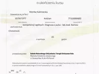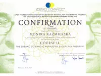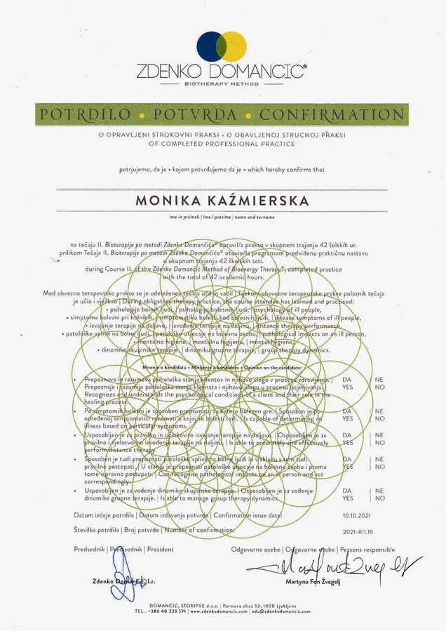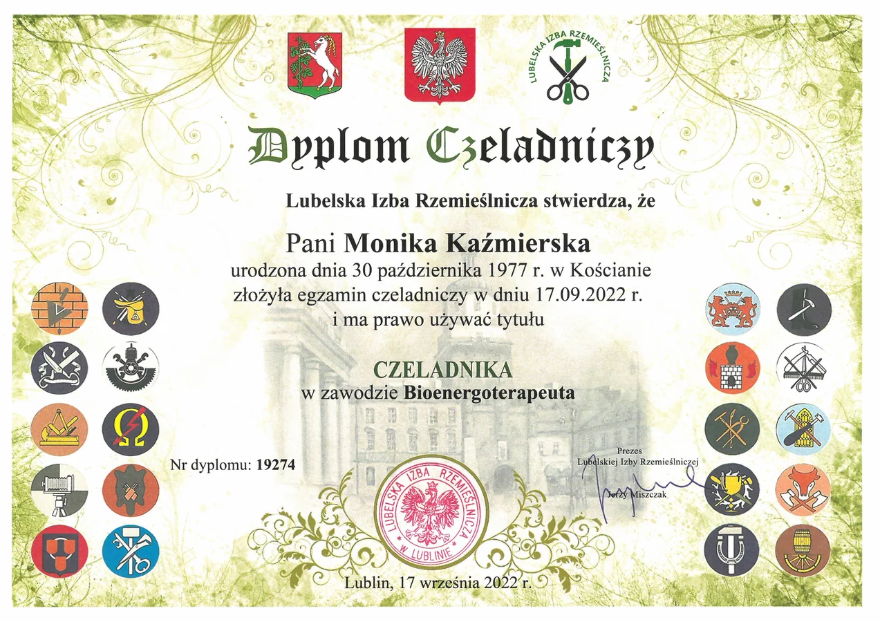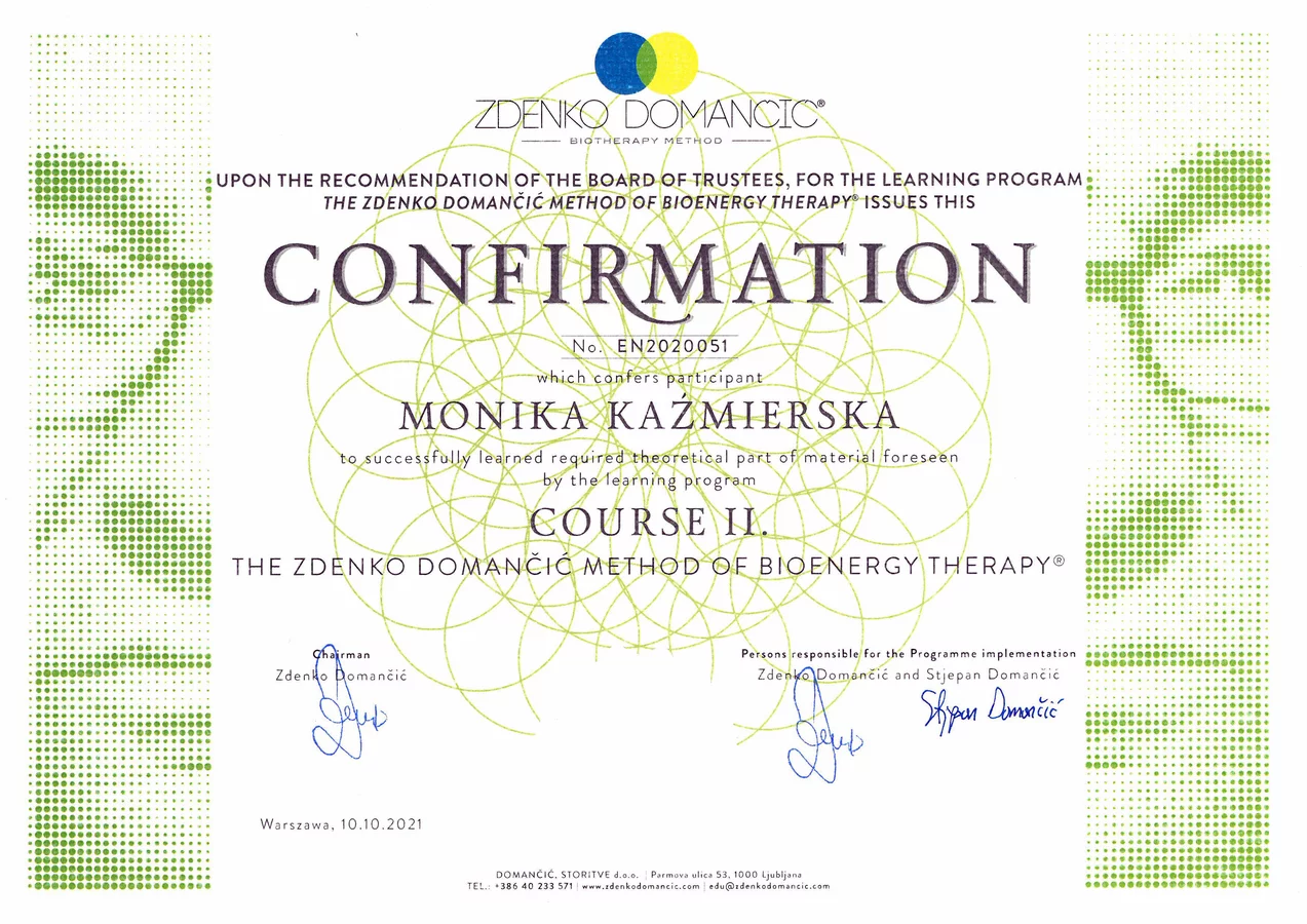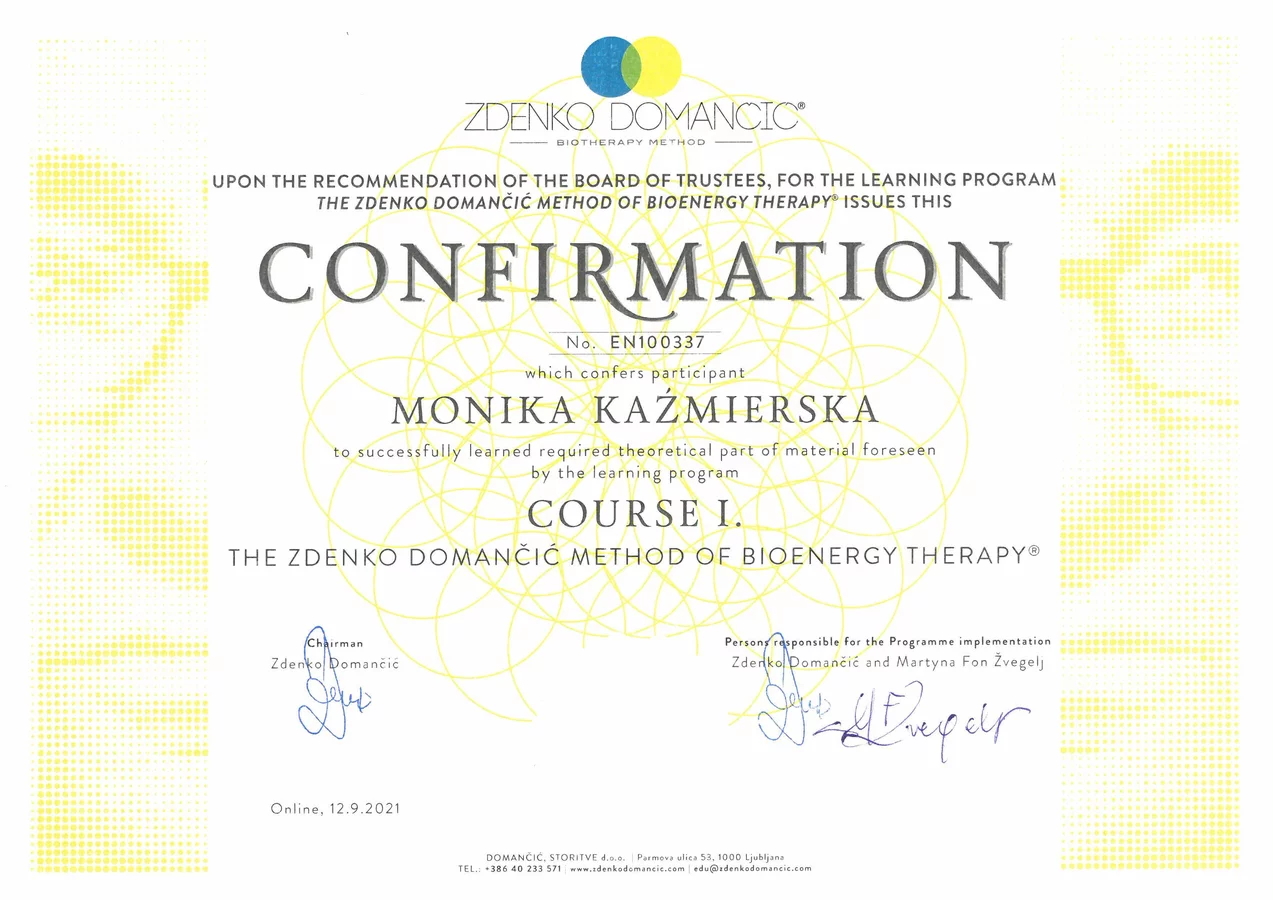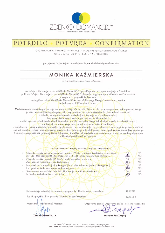 Skończyłam kurs z dietetyki profilaktycznej i leczniczej według tradycyjnej medycyny chińskiej. W ślad za tym zrobiłam kurs diagnozy z pulsu. Następnie zaczęłam widzieć i odczuwać więcej niż do tej pory. Moja sensytywność wzrastała każdego dnia. W związku z powyższym szukałam odpowiedzi na pojawiające się doświadczenia typu odczuwanie i widzenie energii. Okazało się, że mam wszelkie predyspozycje do uzdrawiania energią. By móc dalej realizować swoje zainteresowania i jednocześnie pasję skończyłam kurs I i II stopnia metody Zdenko Domancica uzyskując certyfikat terapeuty tej właśnie metody. Ponadto zdałam egzamin w Lubelskiej Izbie Rzemieślniczej uzyskując zawód bioenergoterapeuty.